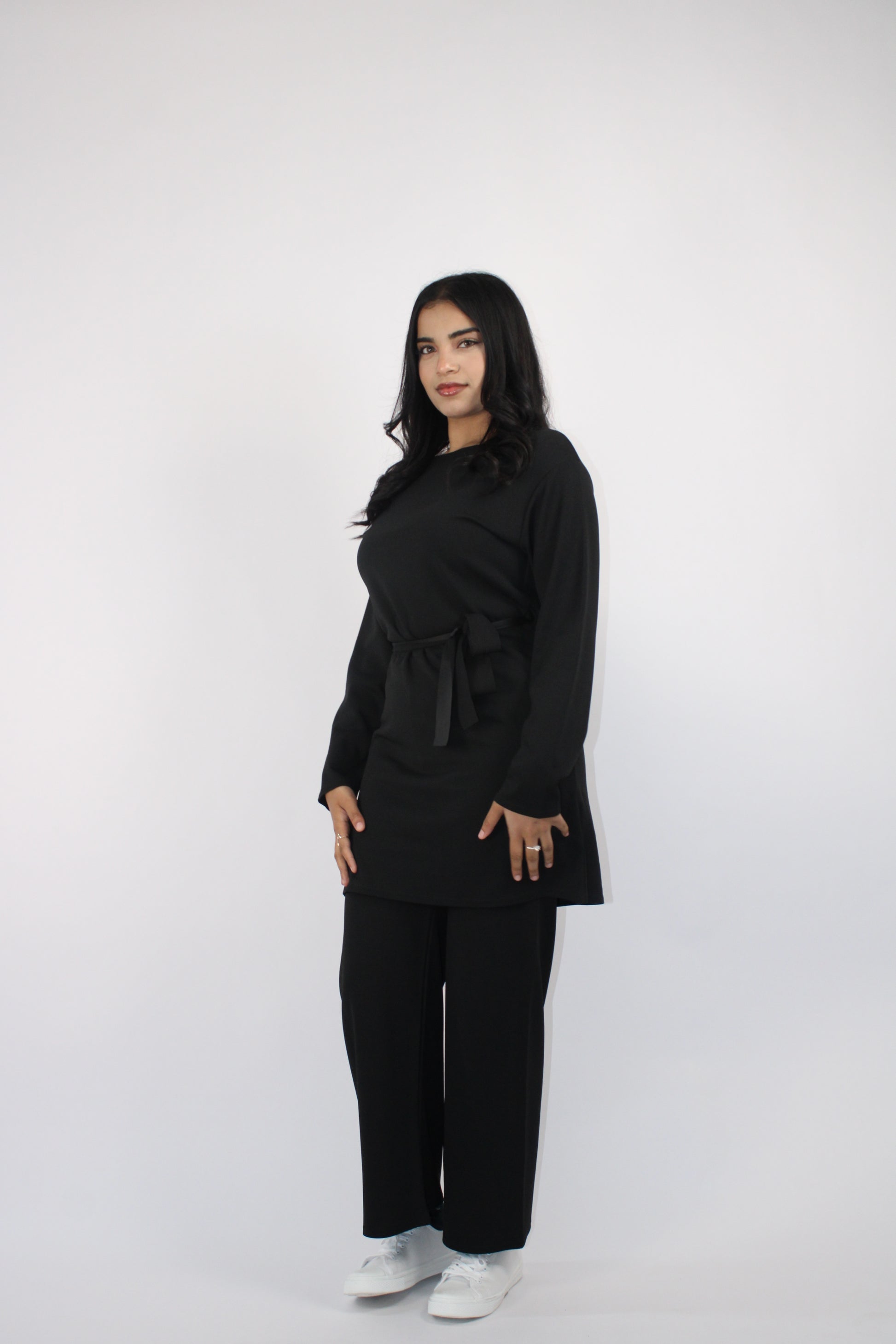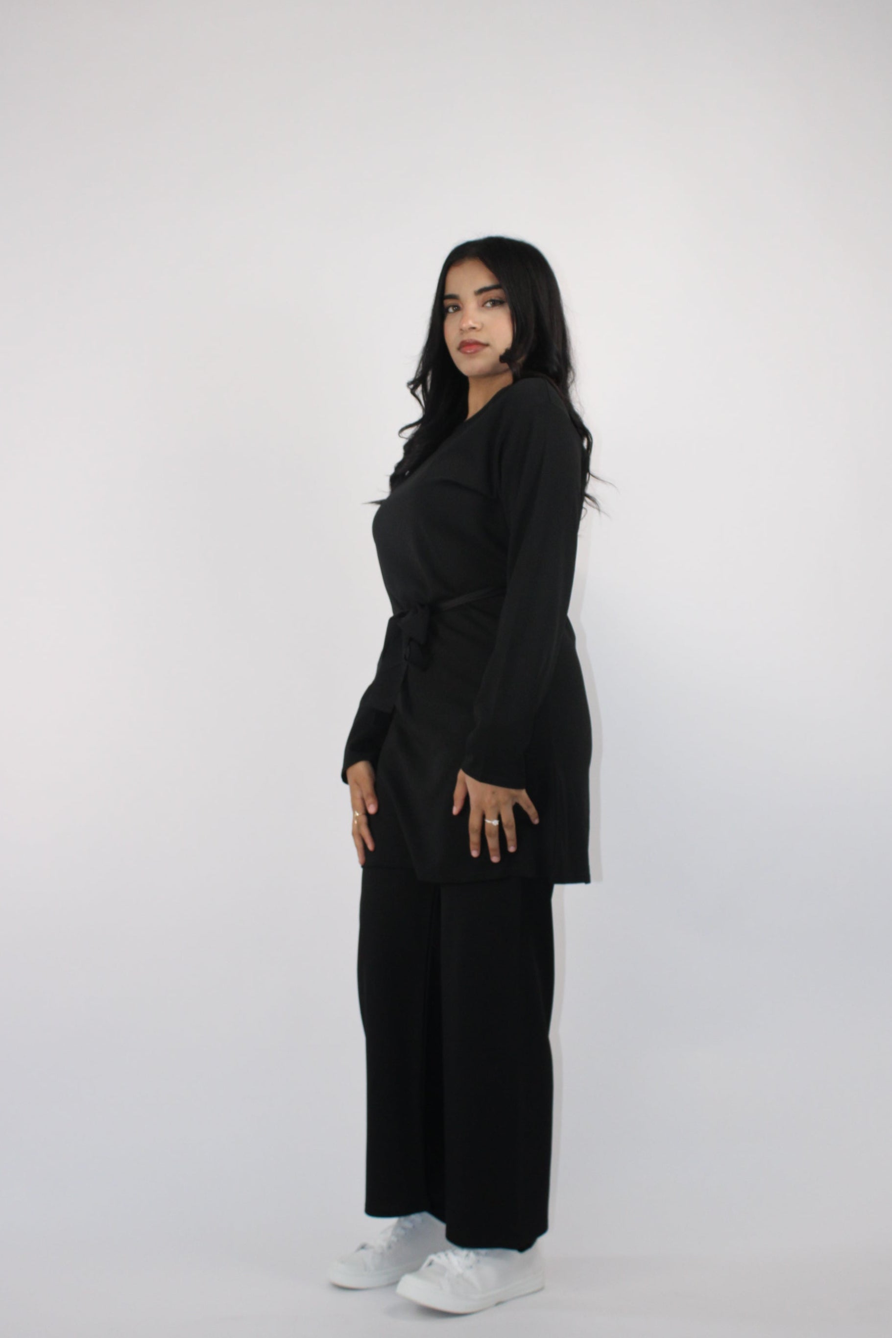 BLACK CREPE LONG SLEEVE BELTED CO ORD SET