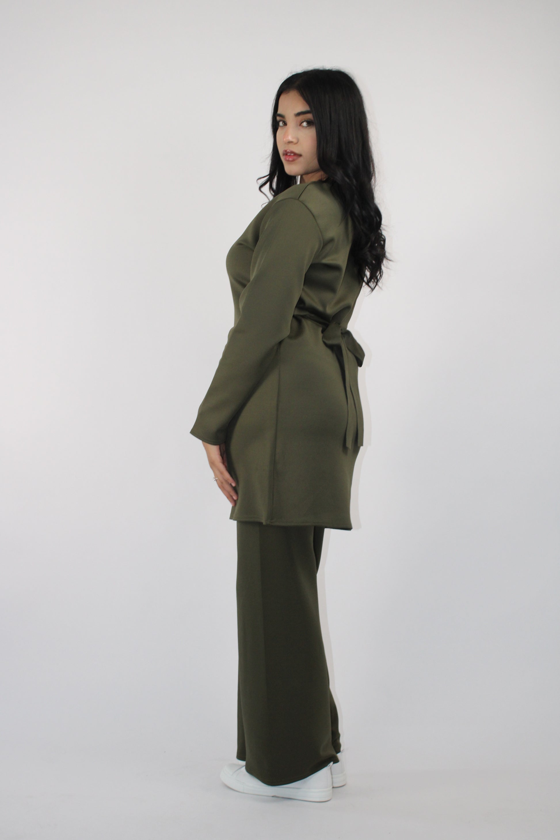 KHAKI CREPE LONG SLEEVE BELTED CO ORD SET