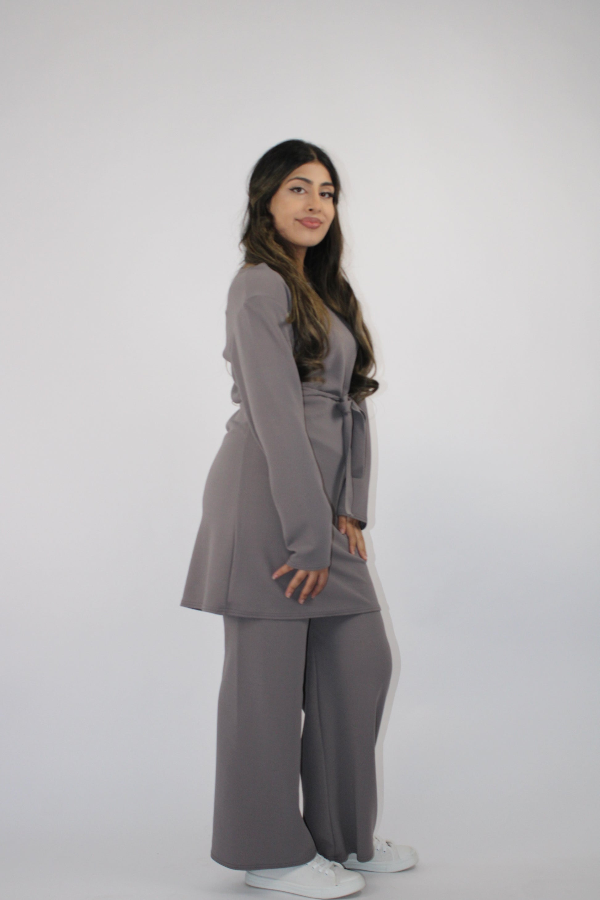 Introducing our latest co-ord set, perfect for those who want to look stylish and feel comfortable at the same time. This set includes a long sleeve top and wide leg trousers, both made from the same material. The long sleeve design provides warmth and coverage for the arms, making it perfect for cooler weather. The belted feature accentuates the waistline and creates a flattering silhouette, while also providing a secure fit.