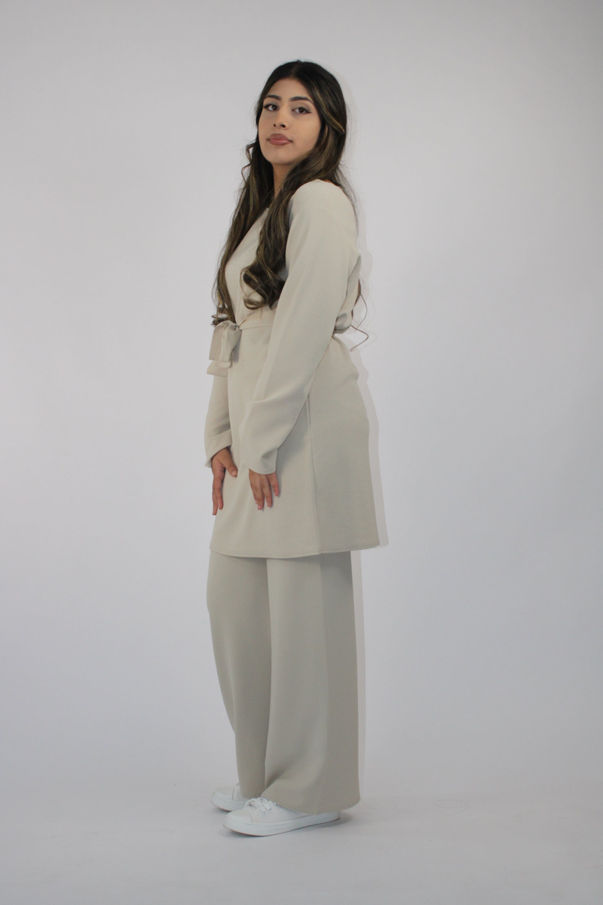 Introducing our latest co-ord set, perfect for those who want to look stylish and feel comfortable at the same time. This set includes a long sleeve top and wide leg trousers, both made from the same material. The long sleeve design provides warmth and coverage for the arms, making it perfect for cooler weather. The belted feature accentuates the waistline and creates a flattering silhouette, while also providing a secure fit.