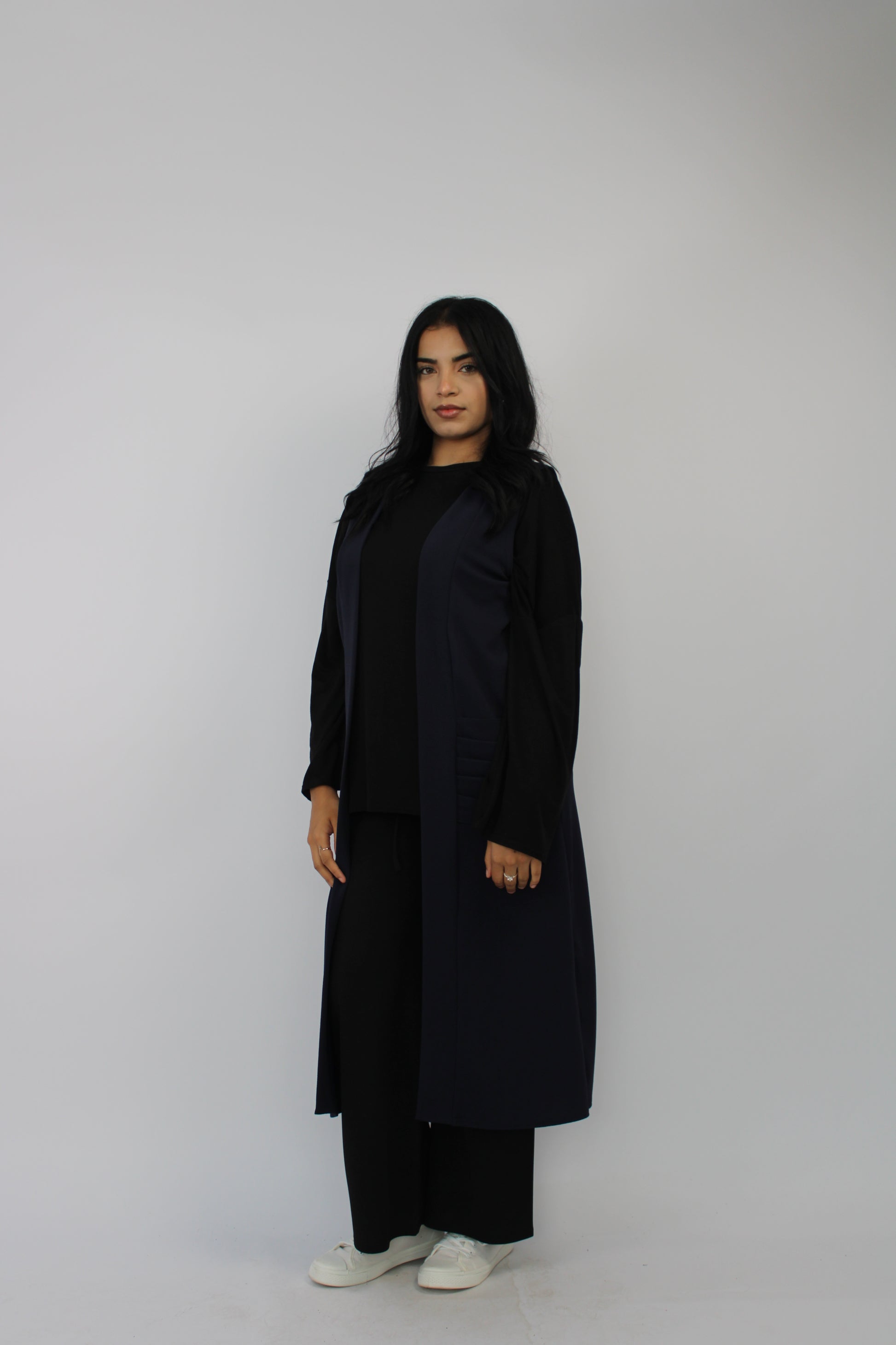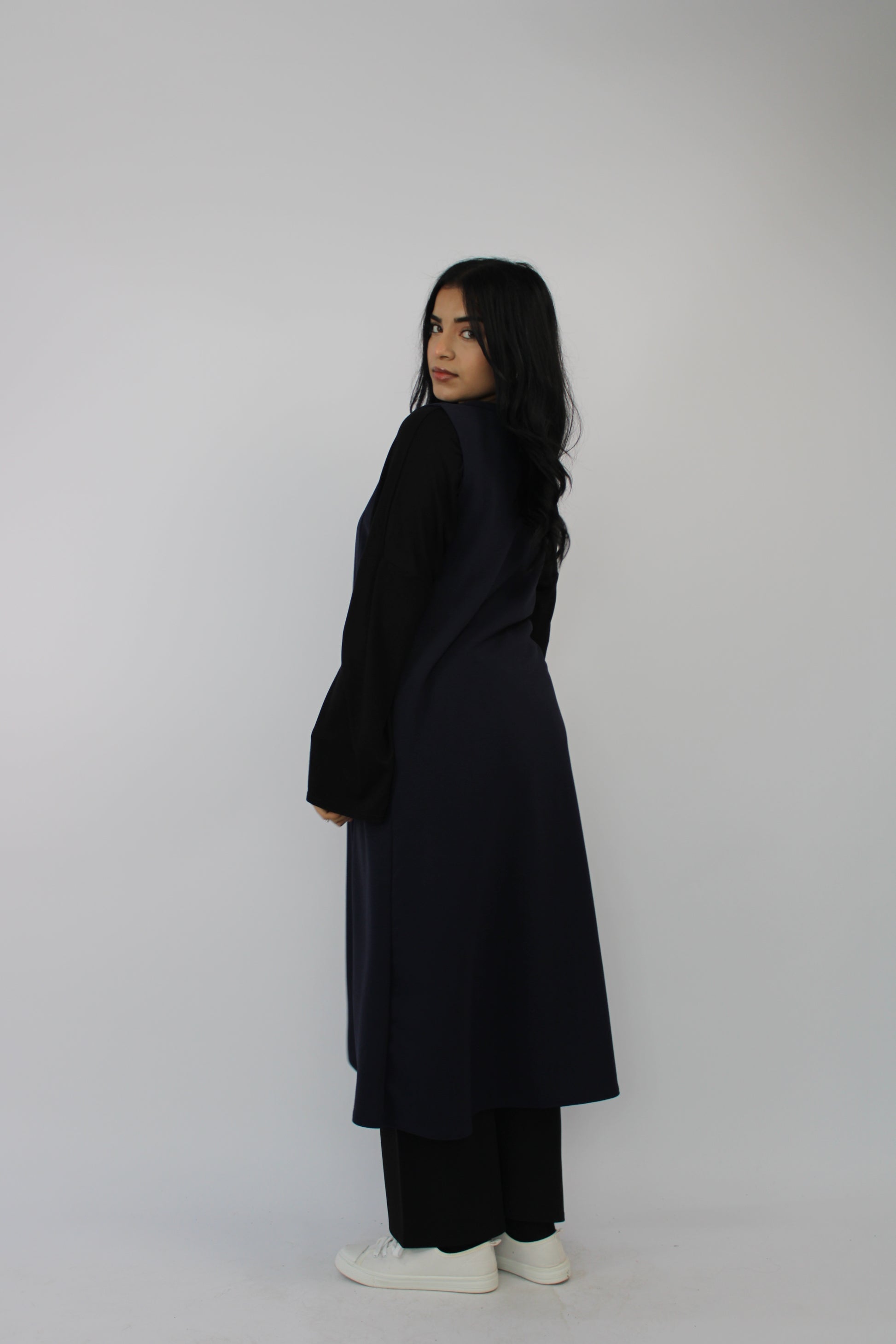 NAVY SLEEVELESS PLEATED POCKET LONG CARDIGAN