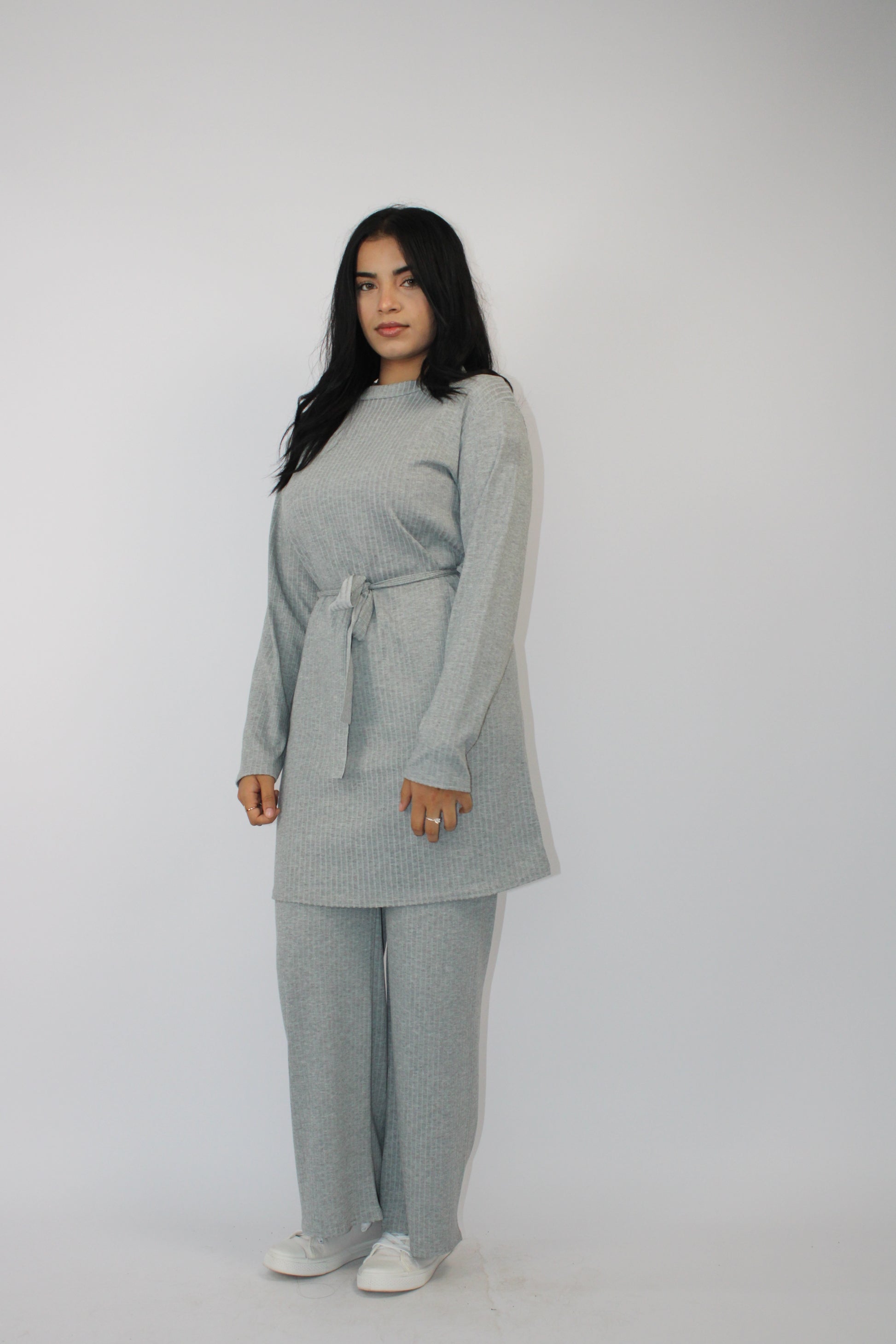 GREY RIBBED LONG SLEEVE BELTED CO ORD SET