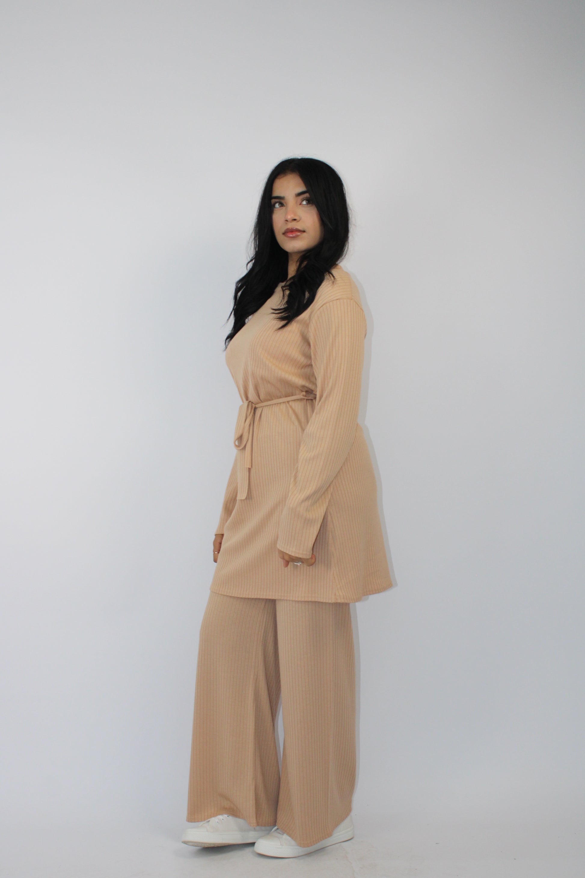 CAMEL RIBBED LONG SLEEVE BELTED CO ORD SET